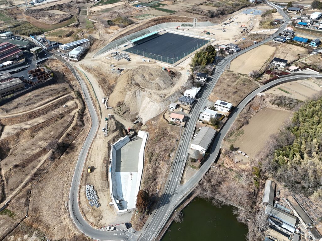 サッカーグラウンドでは、アスファルト舗装と防球ネットの設置が終わっており、3月から人工芝の工事を始める予定です。